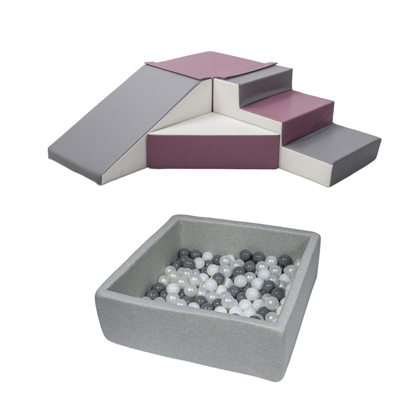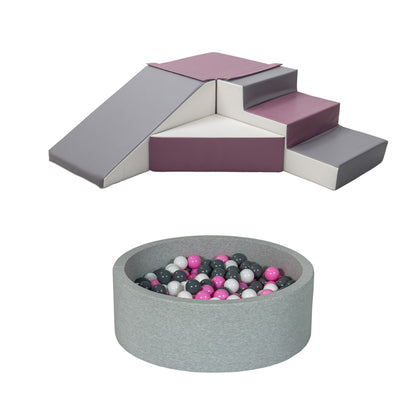 BUNDLE UP AND SAVE!! This bundle includes the Purple, Grey & White Slide & Step Soft Play Set and Grey Ball Pit.