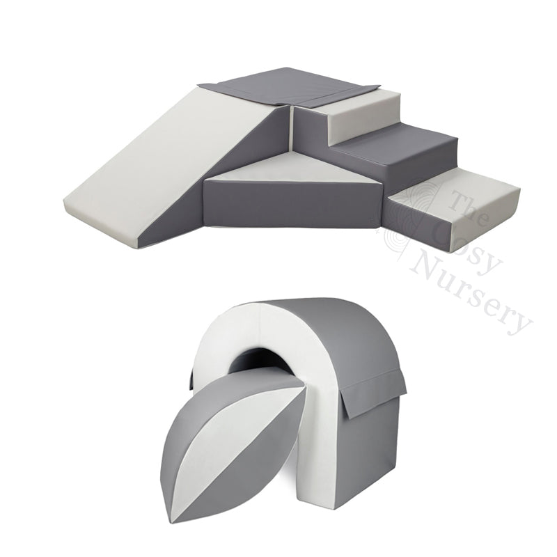 BUNDLE UP AND SAVE!! This bundle includes the Grey and White Slide & Step Soft Play Set and grey and white Bridge and Ball.