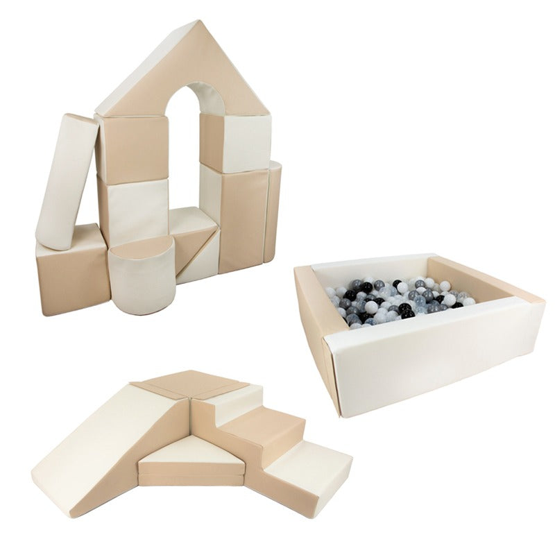 BUNDLE UP AND SAVE!! This bundle includes the Beige & White Castle Building Block Set, Slide & Step Soft Play Set and Ball Pit.